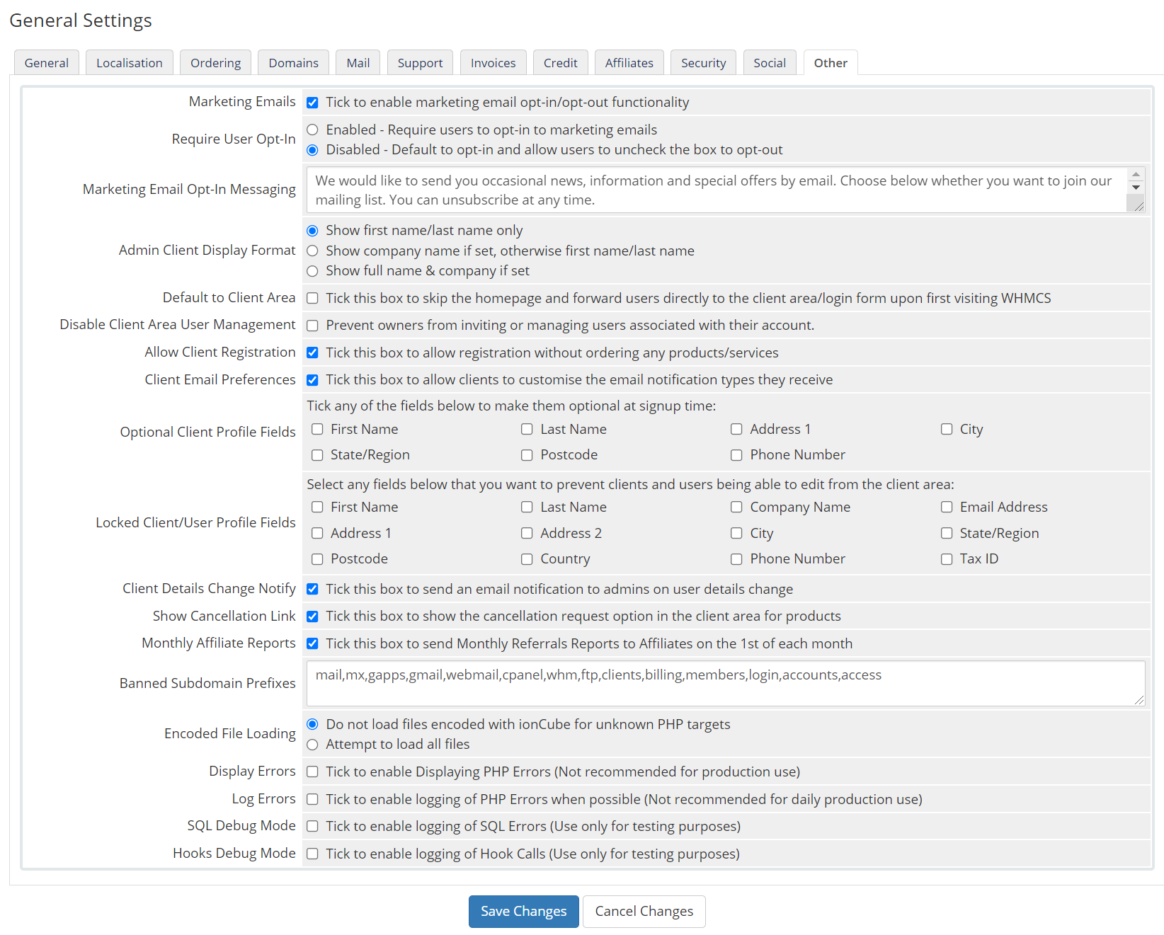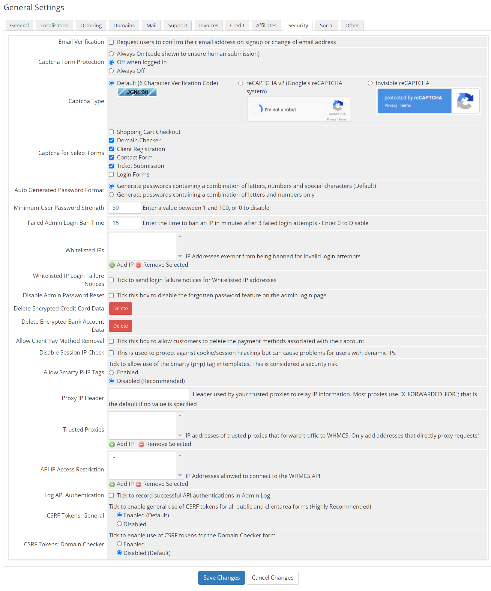 - reCAPTCHA – This setting will protect your forms and should be enabled. You have the option to choose from a CAPTCHA that comes with WHMCS, or you can use Google’s reCAPTCHA.