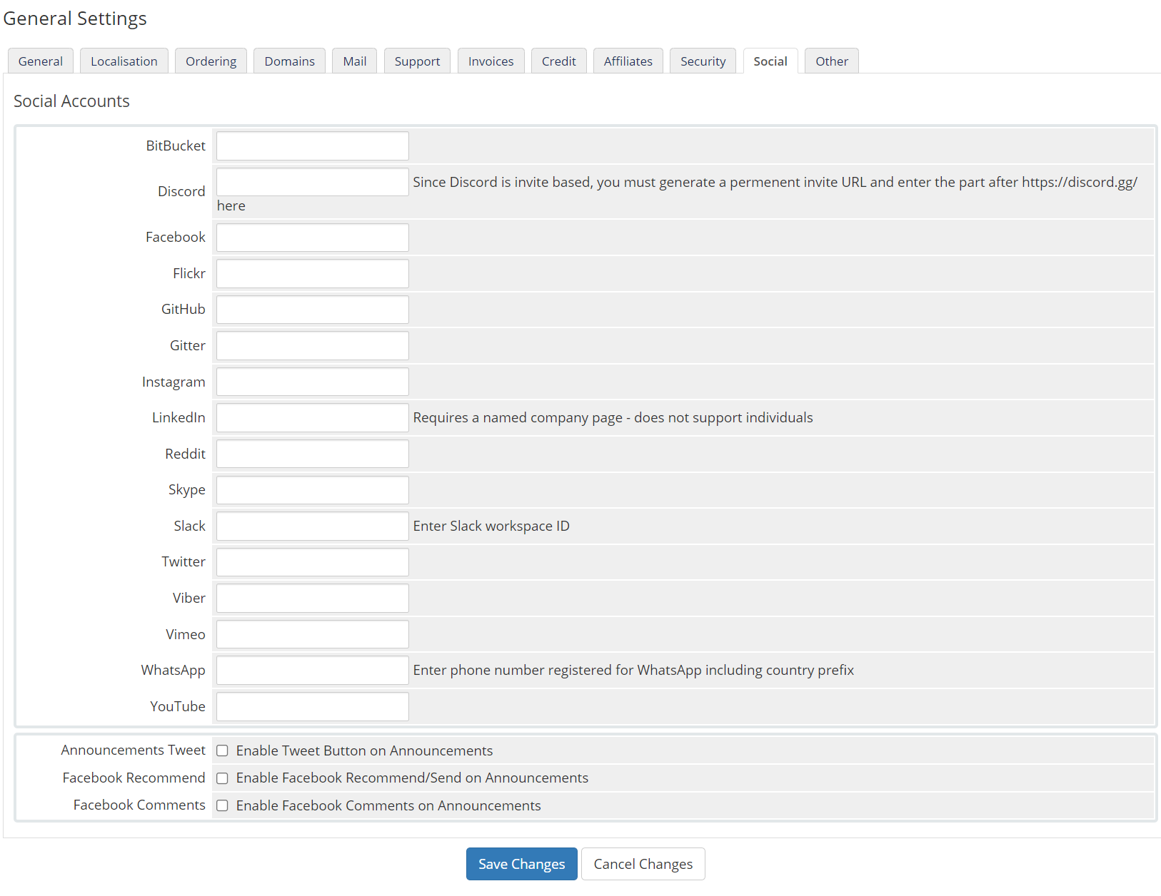 The Social section is where you will enter the information for any Social Media networks you have, like Discord, Twitter, or Facebook.