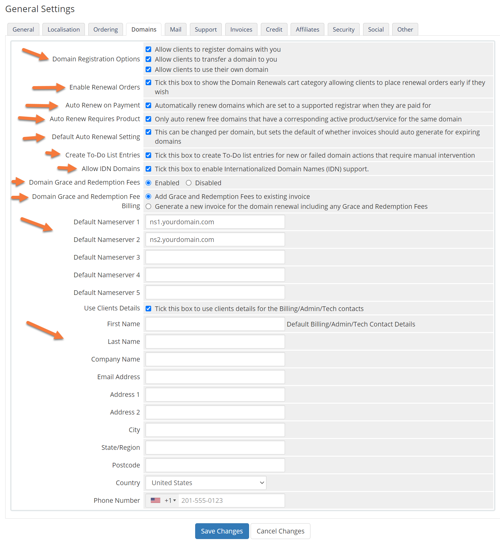 Most of the options on the Domains tab can be left alone, unless you don’t wish to enable certain features, such as IDN domains or Grace and Redemption fees.
