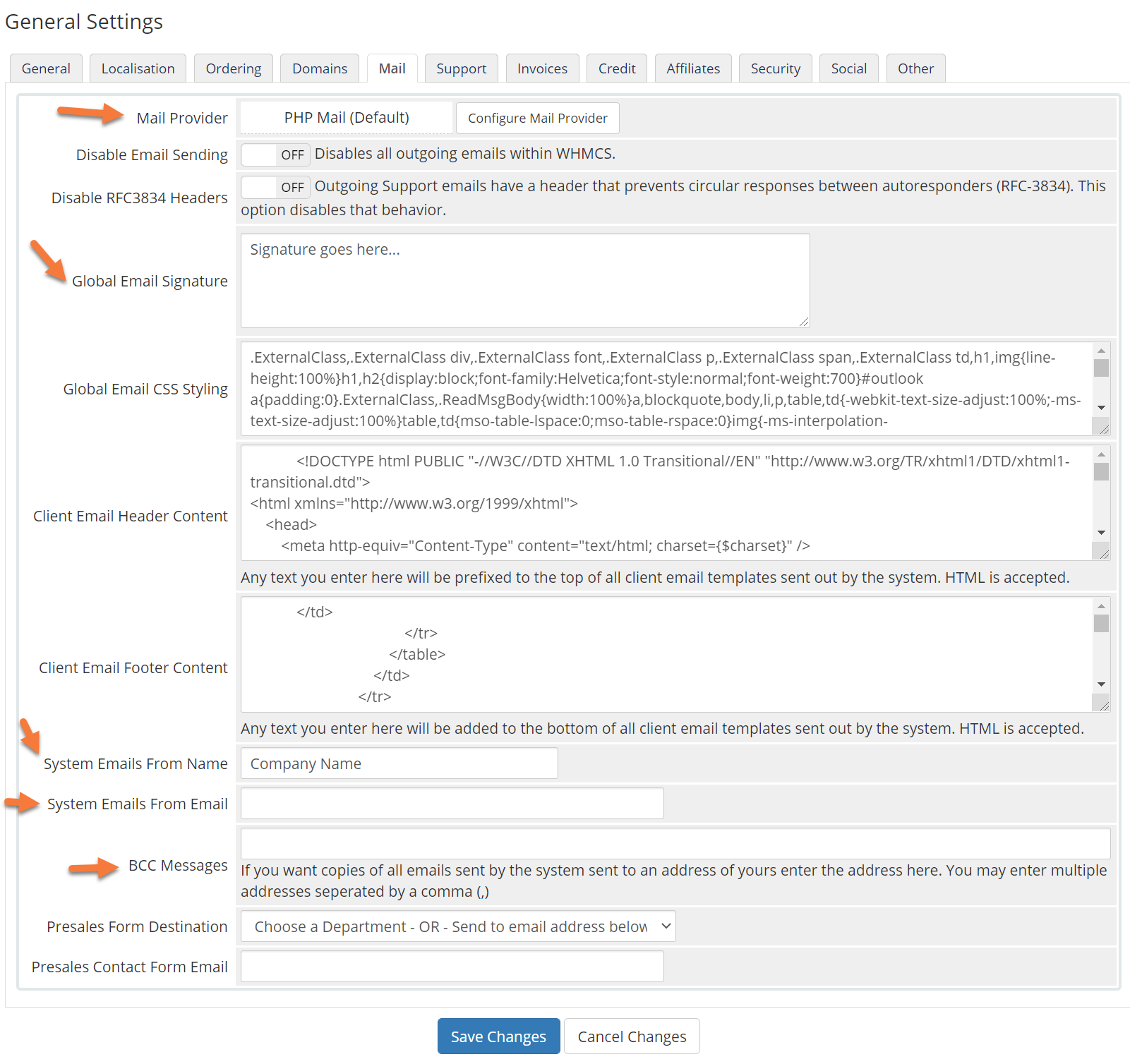 The Mail area contains a very important setting you must modify to use WHMCS successfully at ChemiCloud.