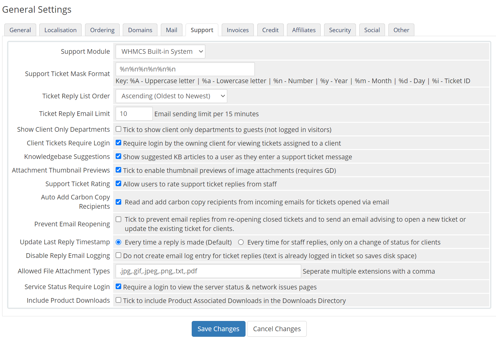 The Support section controls settings related to the built-in Help Desk / Support Desk functionality of WHMCS. Most of the settings here are good to go, however, there’s one setting I’d like to call out: