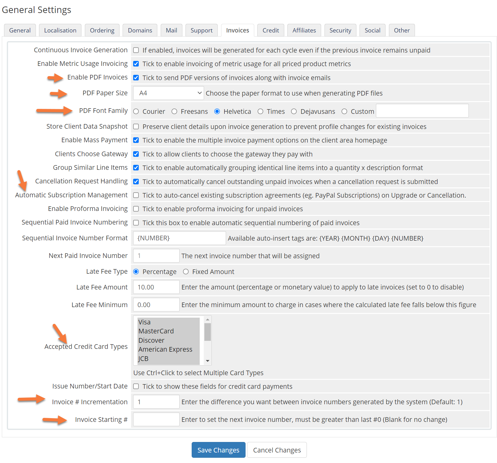 The Invoices tab contains a number of settings you should review, at the very least, including:
