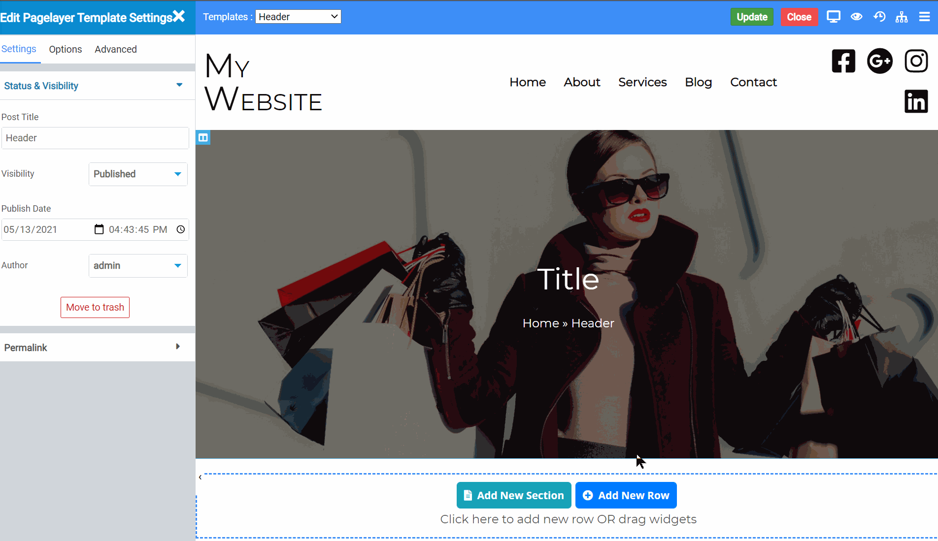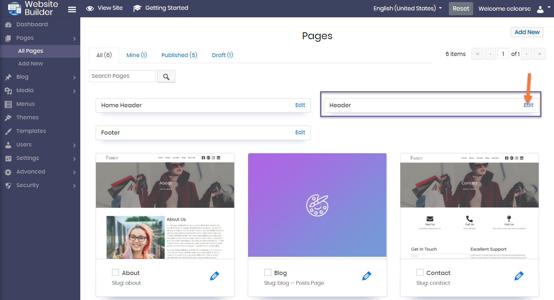 Step 4: To add your custom logo, you need to access the Header that is on every page. To do this, click Pages from the menu on the left then click All Pages.