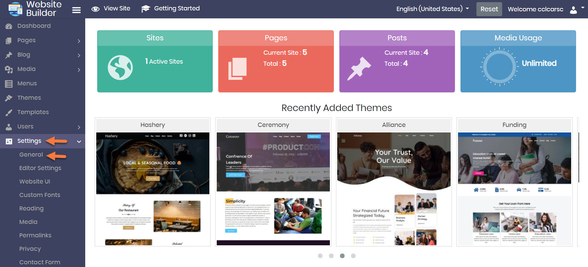 Step 4: When the Website Builder Admin opens, click Settings from the tool menu on the left, then click General.