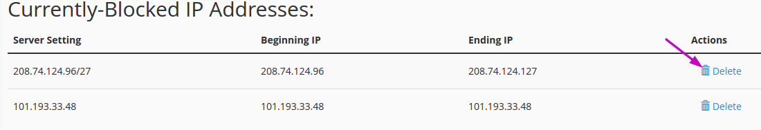 4) If you scroll down on the same page, you’ll see a list of all the blocked IPs, from here you can also delete an IP from the block list.