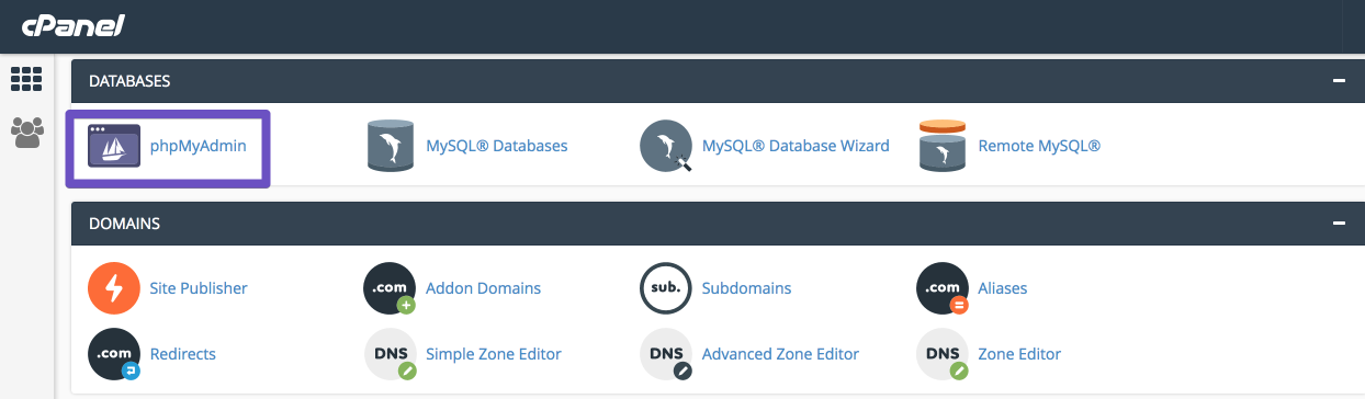 2) Look for the “DATABASES” section and click on “phpMyAdmin”. You’ll be redirected to the phpMyAdmin interface.