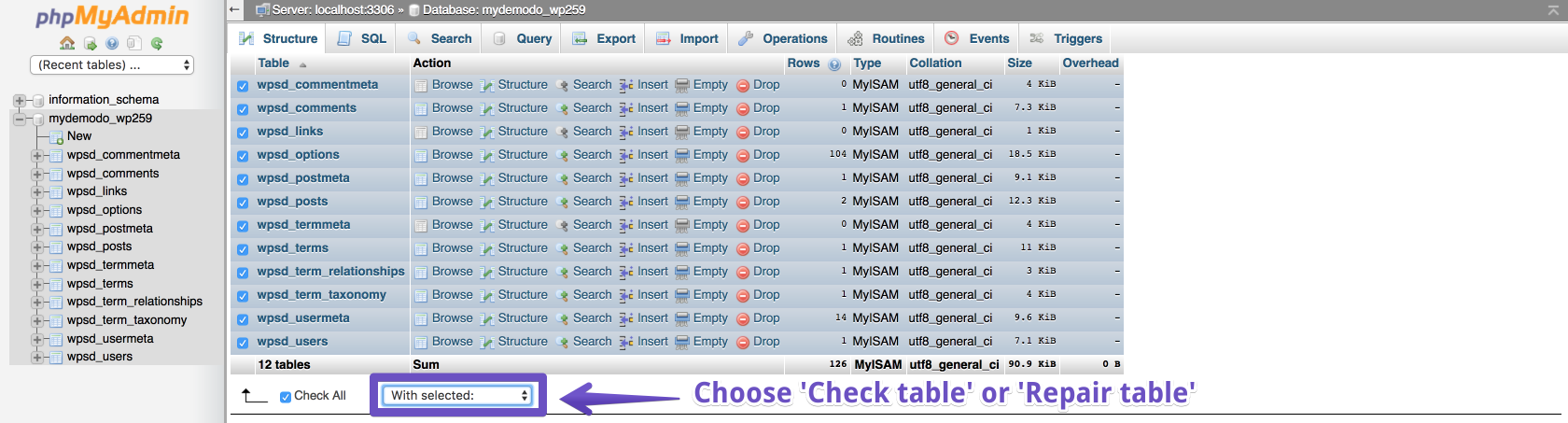 6) Click the drop-down With selected: ]and choose Check table or Repair table. This will execute the CHECK/REPAIR TABLE SQL query on the selected tables and they will be checked or repaired.