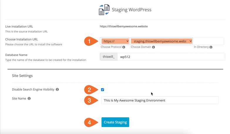Step 5) Choose the installation URL on which the staging will be created. In our case, we’ve selected the staging.thiswillbemyawesome.website subdomain from the dropdown menu. The protocol should be https://
