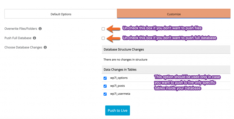 - Customize: with this option you will be able to choose files, full database, and tables structures, and tables data you want to push.