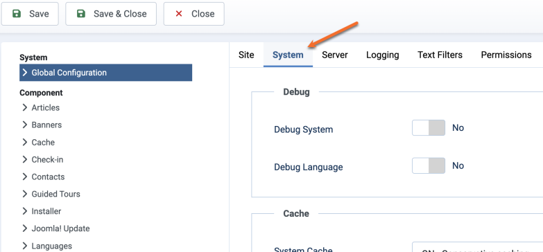 1) Log into your Joomla Admin Dashboard and navigate from the left sidebar to Systems;
