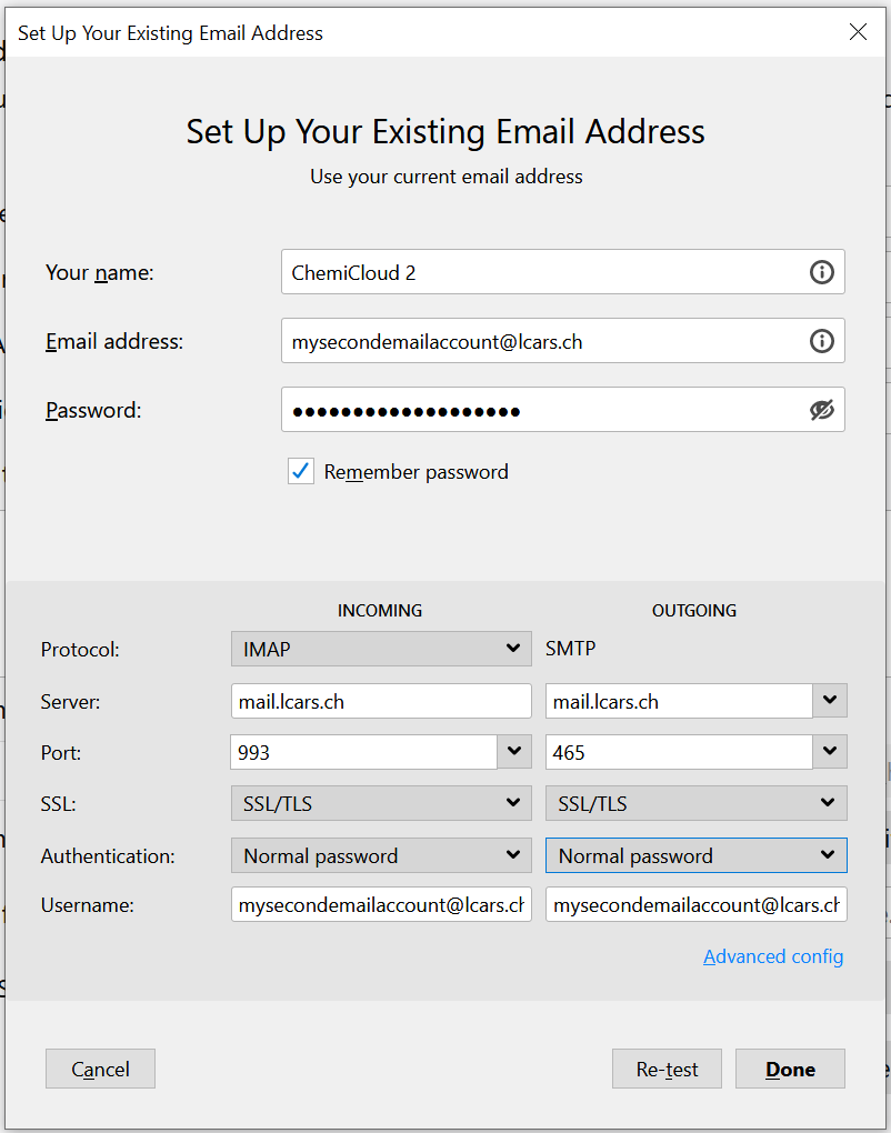 When you’ve finished, click Done. Thunderbird will perform a connection test to validate the server information + username and password you have provided in the configuration are correct.