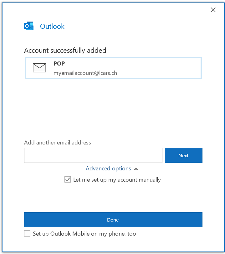 If you want to add another account, you can do so by entering the address beneath Add another email address, clicking Advanced Options, and check the box next to Let me set up my account manually, and clicking Next.