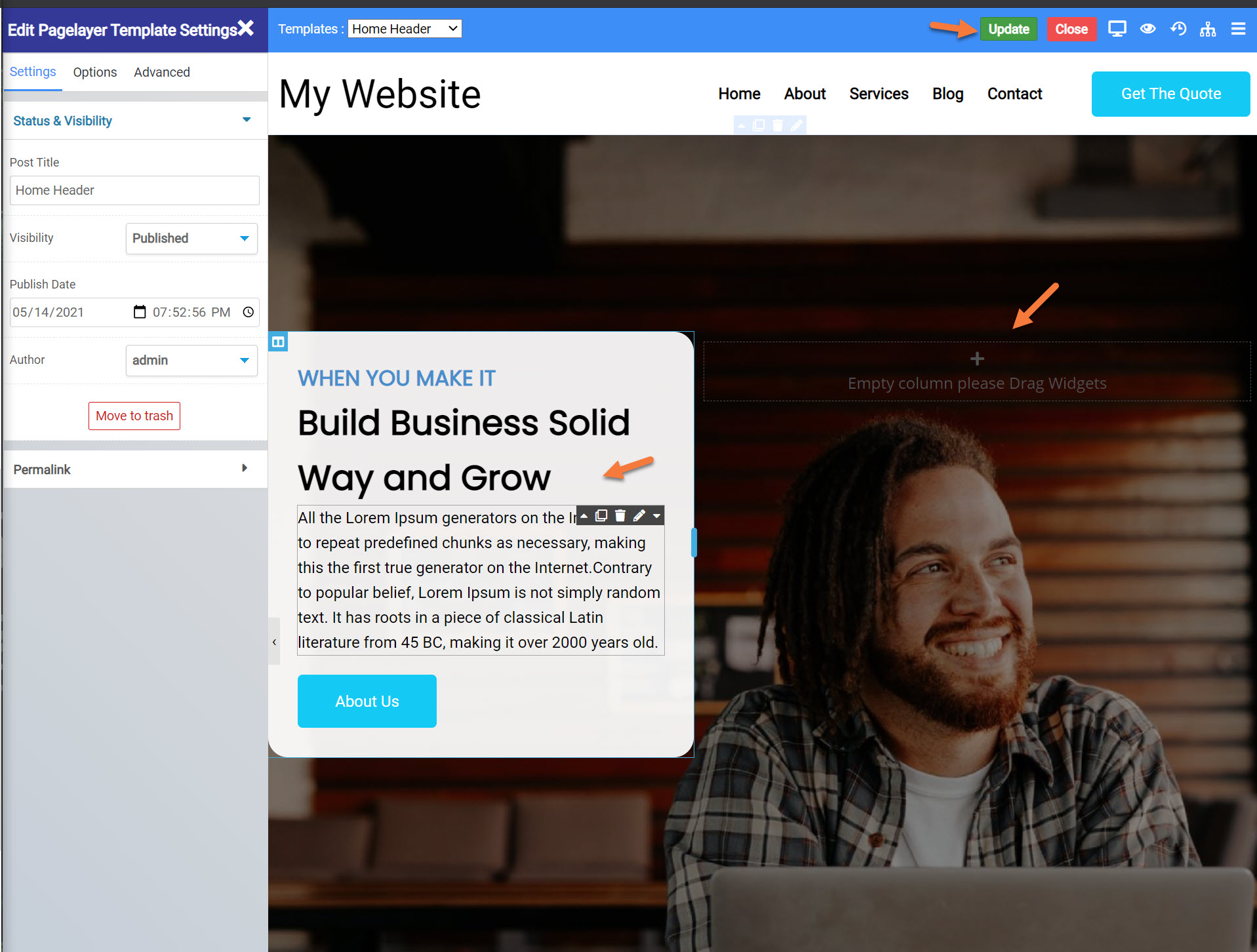 The Website Builder will open and you will be able to edit the widgets and content in the header or footer, depending on what you selected.