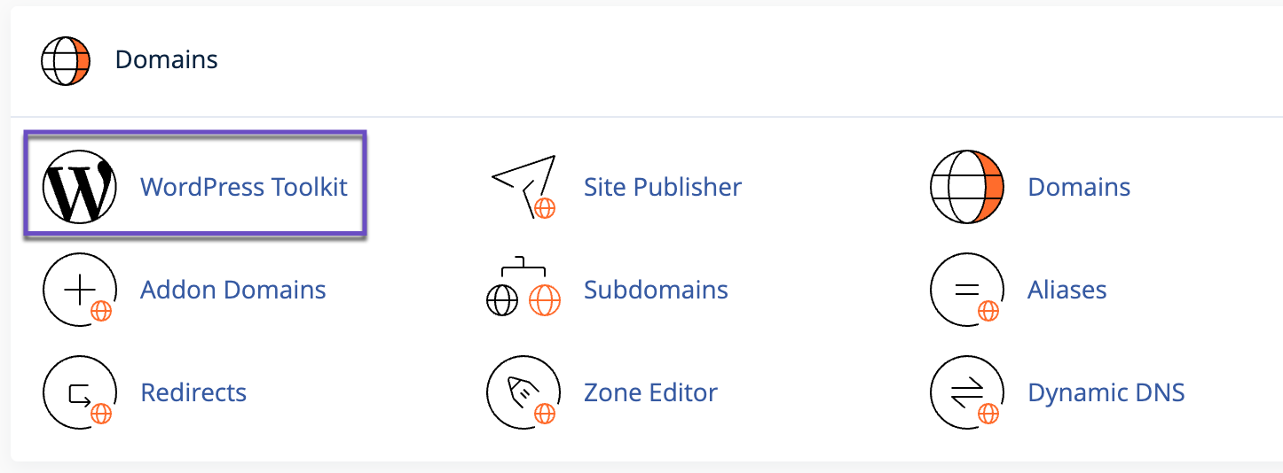 - In the DOMAINS section of the cPanel’s home screen, click WordPress Toolkit: