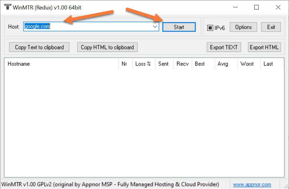 Step 2: Run your MTR Test. To do this, enter a domain name or IP address in the host box, then click Start.