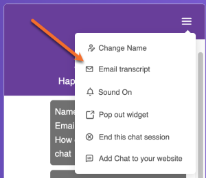 - Click on the hamburger menu in the top right side of the chat window and select Email Transcript;