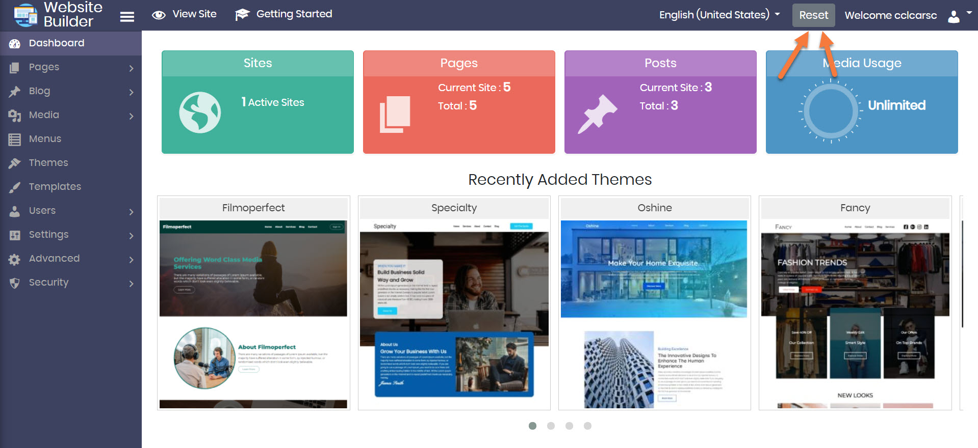 Step 4: When the Website Builder Admin opens, look for the Reset button in the top right corner. Click the Reset button.