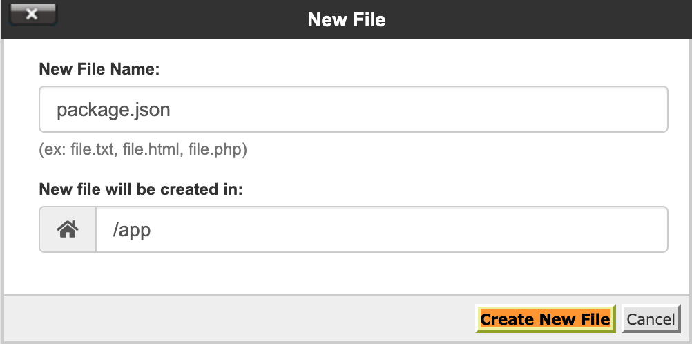 In the New File dialog box, enter the file name package.json and then click the Create New File button.