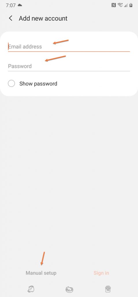 Step 2: Enter the email address and password for the account you’re adding, then tap Manual setup at the bottom.