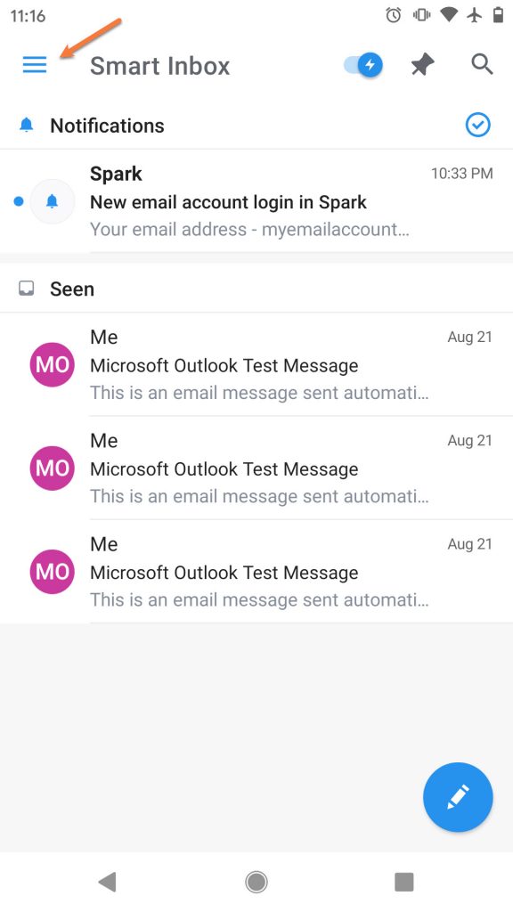 Step 1: Open Spark and tap the ≡ icon (hamburger menu) in the top left corner to open Spark’s menu.