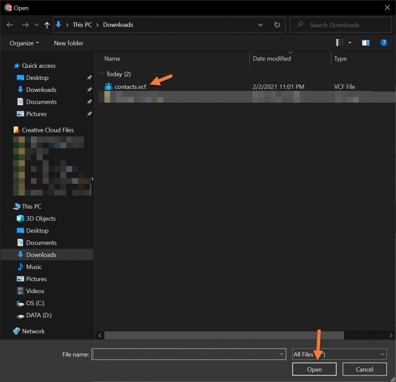 Step 4: A window will appear allowing you to choose the .vcf, .csv, or vCard file from your computer.
