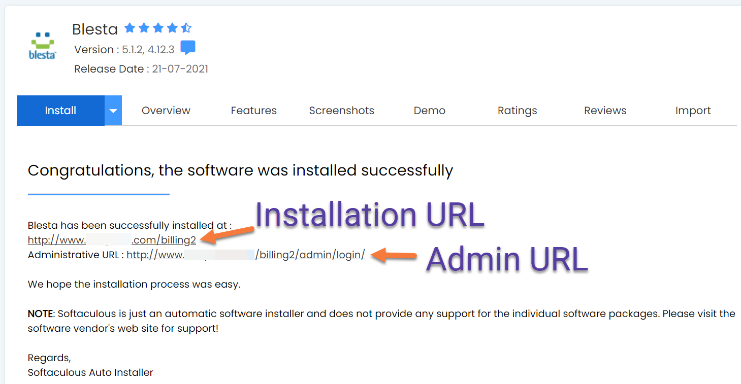 Step 7: Once Blesta has been installed, Softaculous will present you with a successful installation screen, along with the URL of the application and the URL of the Admin login.