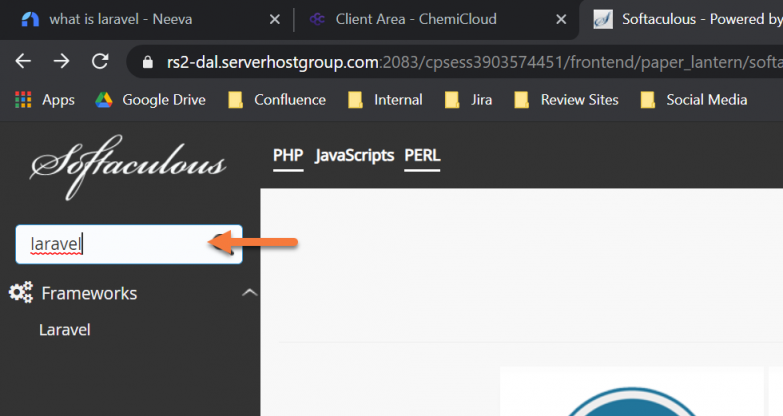 Step 3: Once Softaculous is open, use the search in the top left corner to search for Laravel.