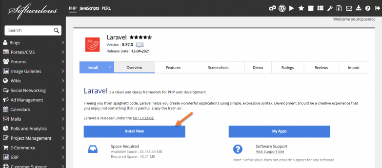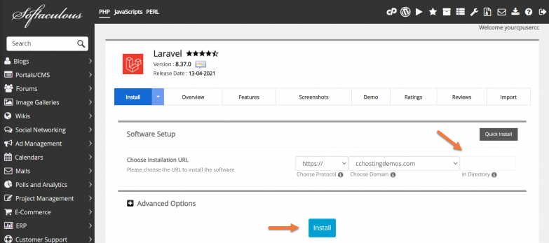 Laravel is available to install in your Softaculous Apps Installer. Follow the steps below to install Laravel.