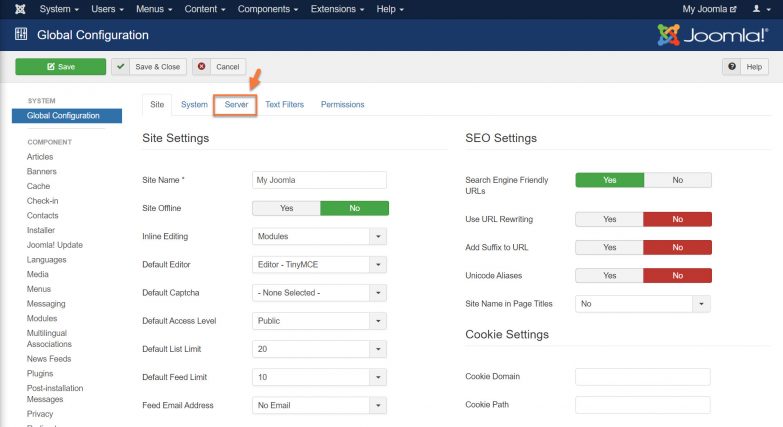 Step 3: In the Global Configuration Menu, click the Server tab: