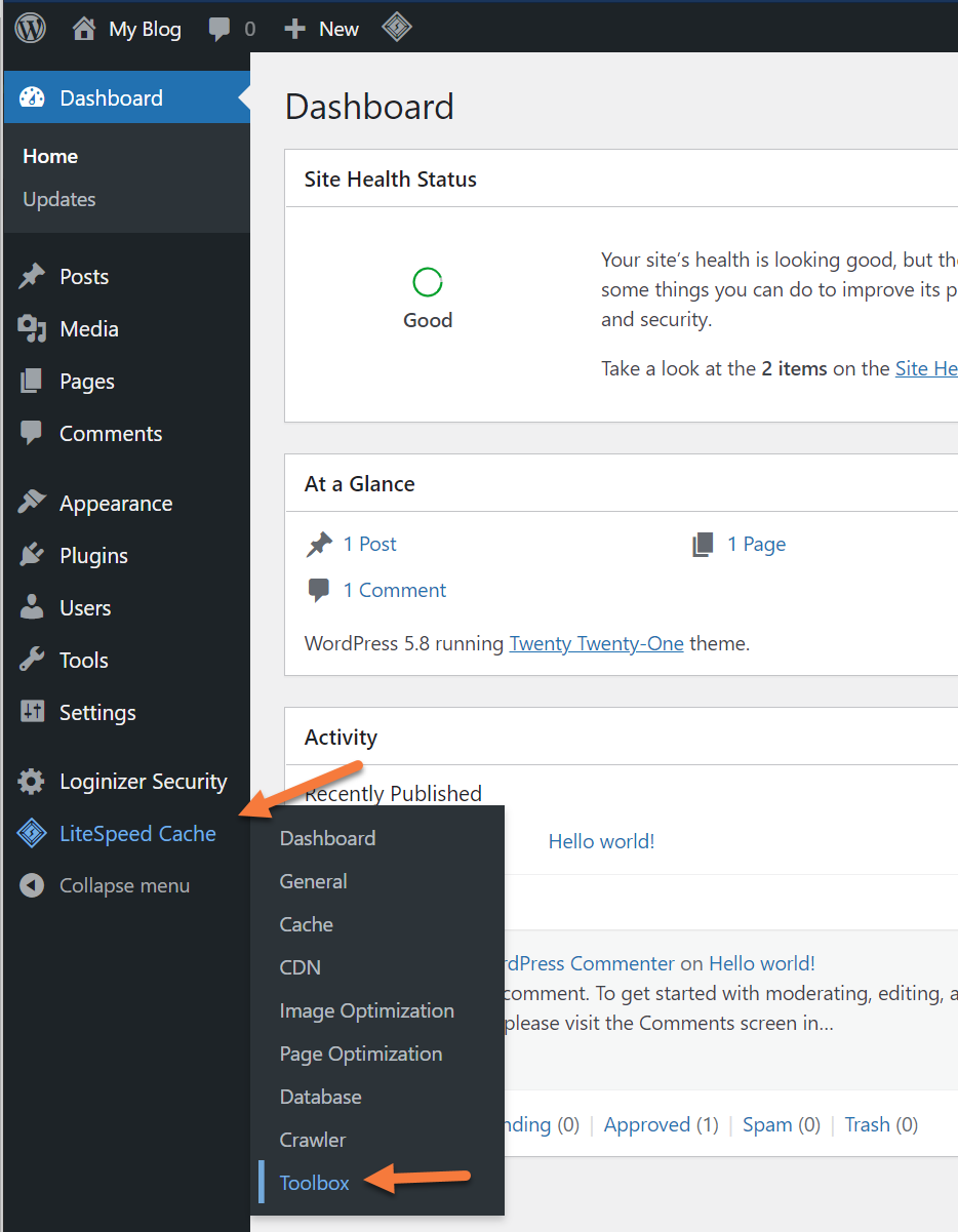 Step 1: Login to your /wp-admin and in the menu on the left, hover over the LiteSpeed Cache plugin, and in the little menu that pops out, click Toolbox.