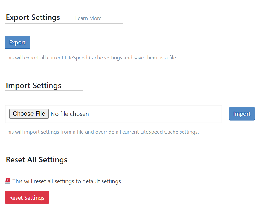 The Export setting allows you to export a configuration file with your current LiteSpeed configuration.