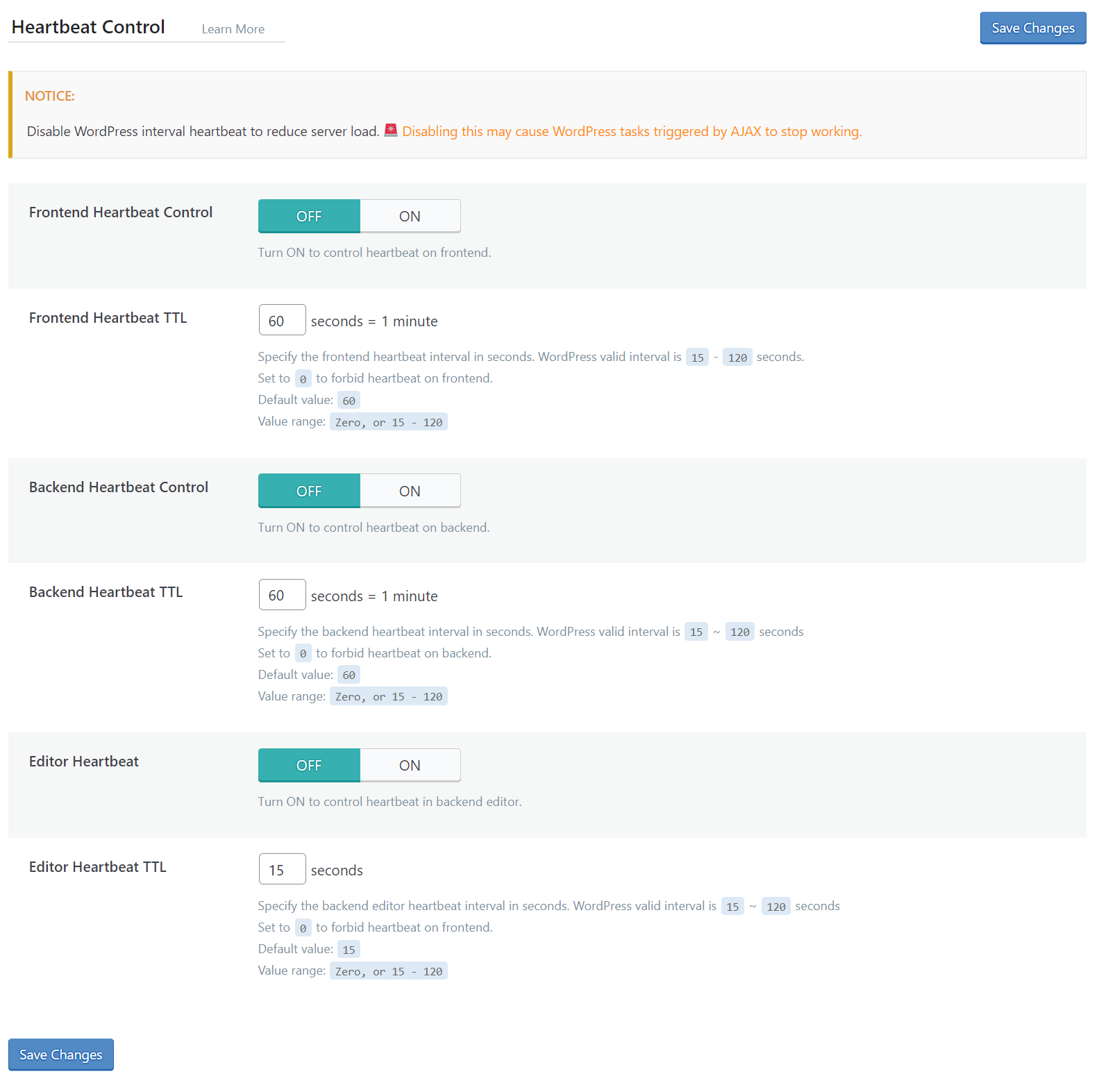 The heartbeat settings allow you to control settings related to the Heartbeat functions in WordPress. Enabling the heartbeat can cause increased server load.