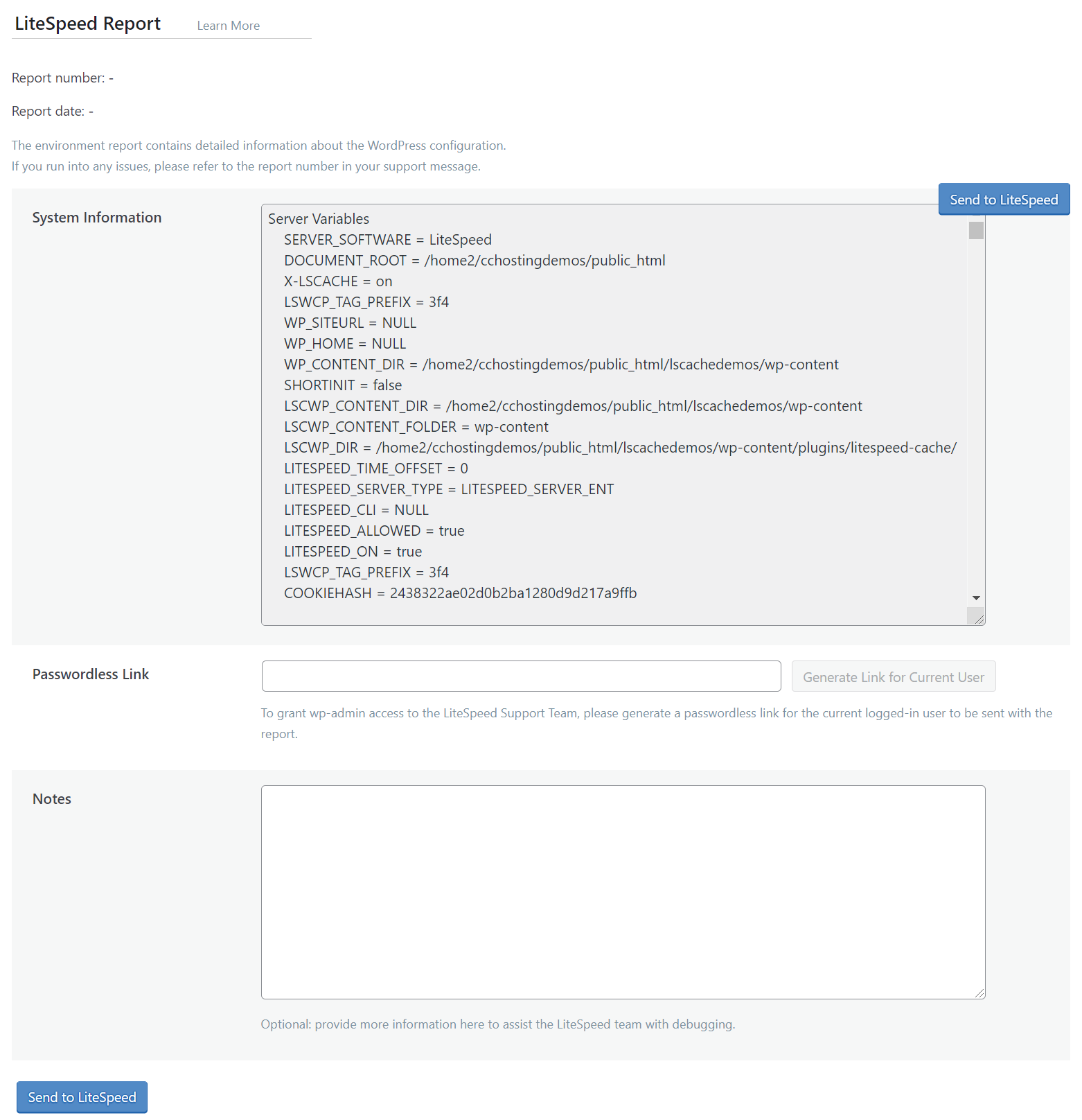 The Report settings allow you to submit a report of your WordPress environment, along with any Notes you may have about it, to LiteSpeed Support. This tab is useful if you have opened a ticket with LiteSpeed.