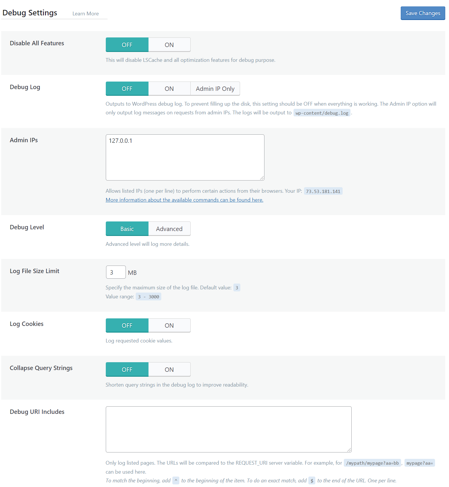 - Debug Log changes the output of WordPress’ log. To prevent filling up your web storage, this setting should be off when everything is working fine. The Admin IP setting of this option will only output log messages on requests from admin IPs. The logs will be output to /wp-content/debug.log.