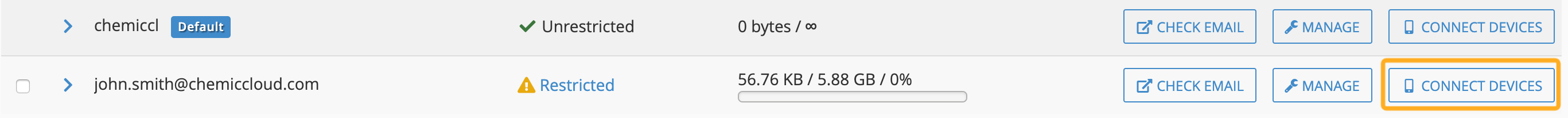 2. Navigating to the far right column on the same line with the Email account options, you will find the CONNECT DEVICES button. Click on it and continue to the next window.