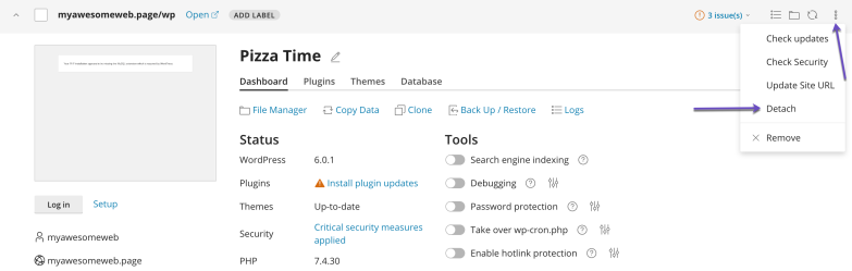 - From the WordPress Toolkit main page, in a site list entry, click the three dots icon, and then click Detach: