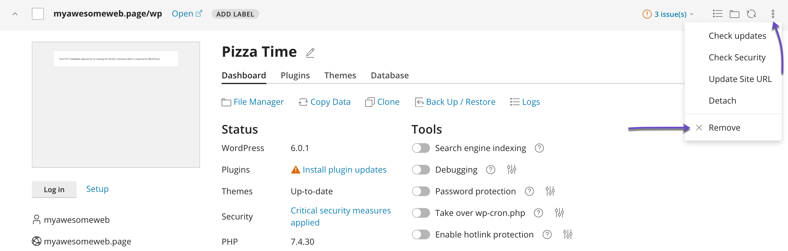 - From the WordPress Toolkit main page, in a site list entry, click the three dots icon, and then click Remove: