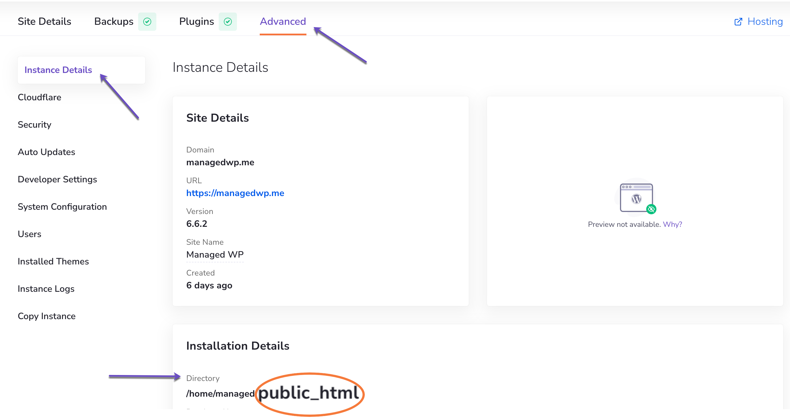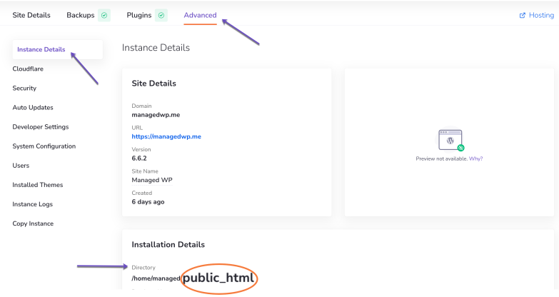 - Scroll down to Installation Details. Here, look for the field labeled Directory—this shows the document root where your site resides (In my example, the directory is “public_html”).