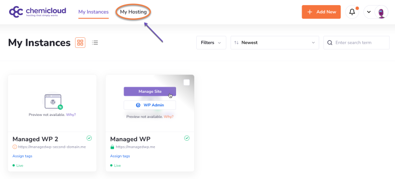 - In your WordPress Manager, click My Hosting in the top header.