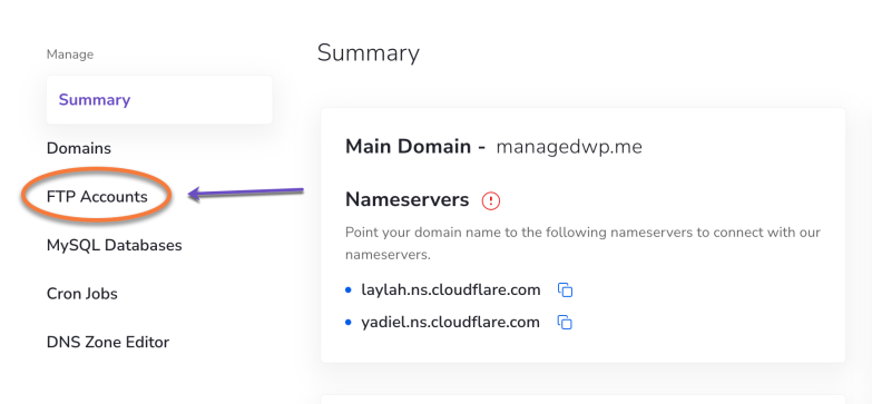 - From the left-hand Manage section, select FTP Accounts.
