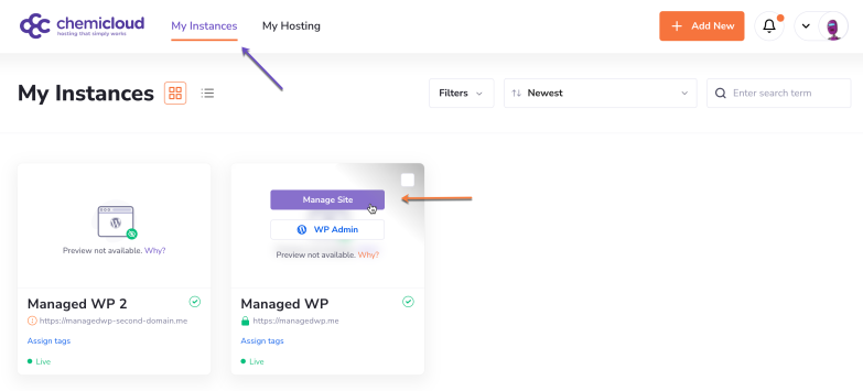 - Log in to your WordPress Manager and select My Instances in the top header.