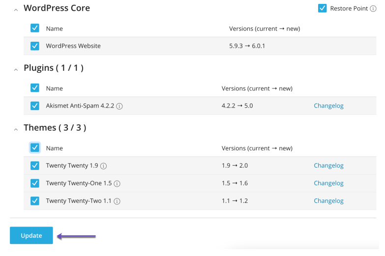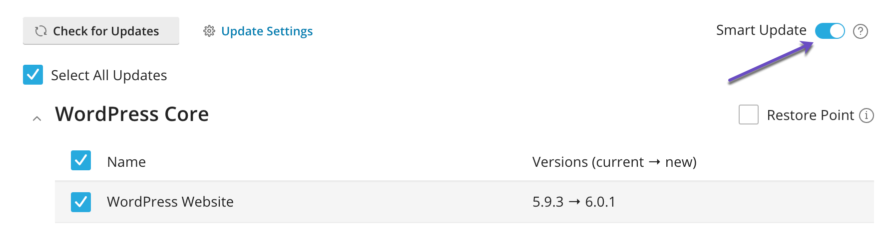 Alternatively, you can use the Smart Update feature. Smart Update enables you to test an update without actually affecting the site. Smart Update does this by creating a complete clone of the website, running several preliminary checks, updating the cloned website, and rerunning the checks to see if the update breaks anything. The results include before-and-after screenshots that you can compare to make an informed decision about whether or not to proceed with the update on your site in production.To enable Smart Update, click the Smart Update toggle button.