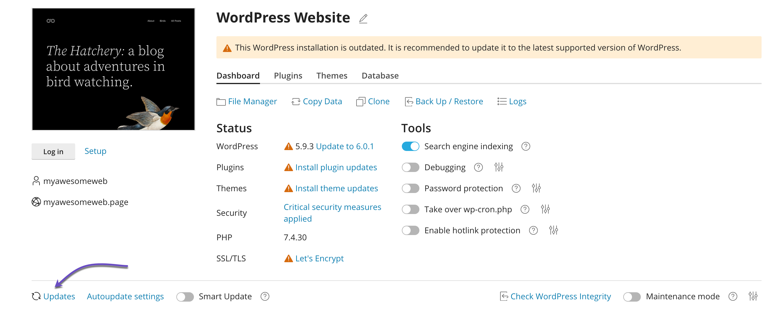 WordPress Toolkit makes updating your site—and keeping it updated—simple. To manage updates for an existing WordPress install using WordPress Toolkit, follow these steps: