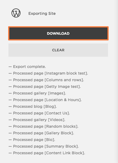 Step 8: Wait for the export to finish. It may take a little while depending on the amount of content on your Squarespace site. Once the export is complete, click Download button to save the .xml file to your computer, or click Clear to erase the export.