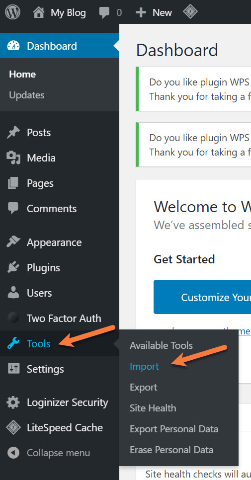 Step 1: Log into your WordPress Admin area (wp-admin) and using the admin tools on the left side, hover over Tools and click Import.