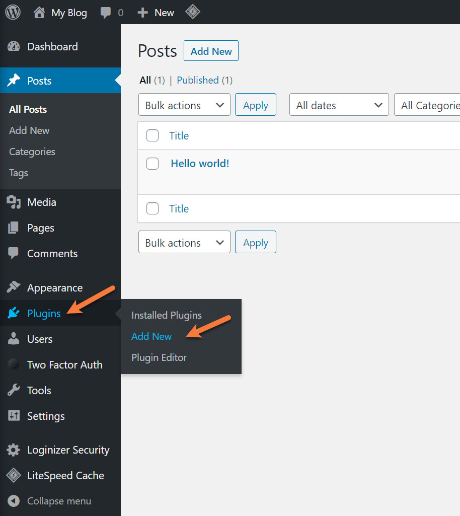 Step 1: To install the plugin in your WordPress Site, go to the Plugins Area on the left side of your wp-admin, then click Add New.