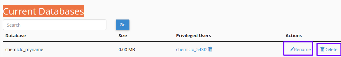 3) Look for the “Current Databases “ section, here you can either change the rename or delete a MySQL database. Click on any of these links and follow the on-screen instructions to complete your action.
