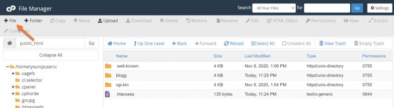 Step 3: When the public_html folder is open, click the + File icon in the top left of the file manager.