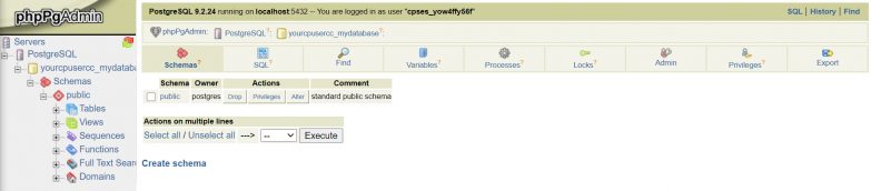 Step 3: After clicking the phpPgAdmin tool, a new tab in your browser will open and you will see a list of your databases on the left side. Click on the database to open it in phpPgAdmin.