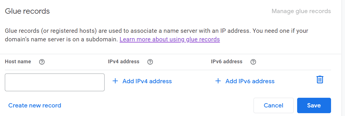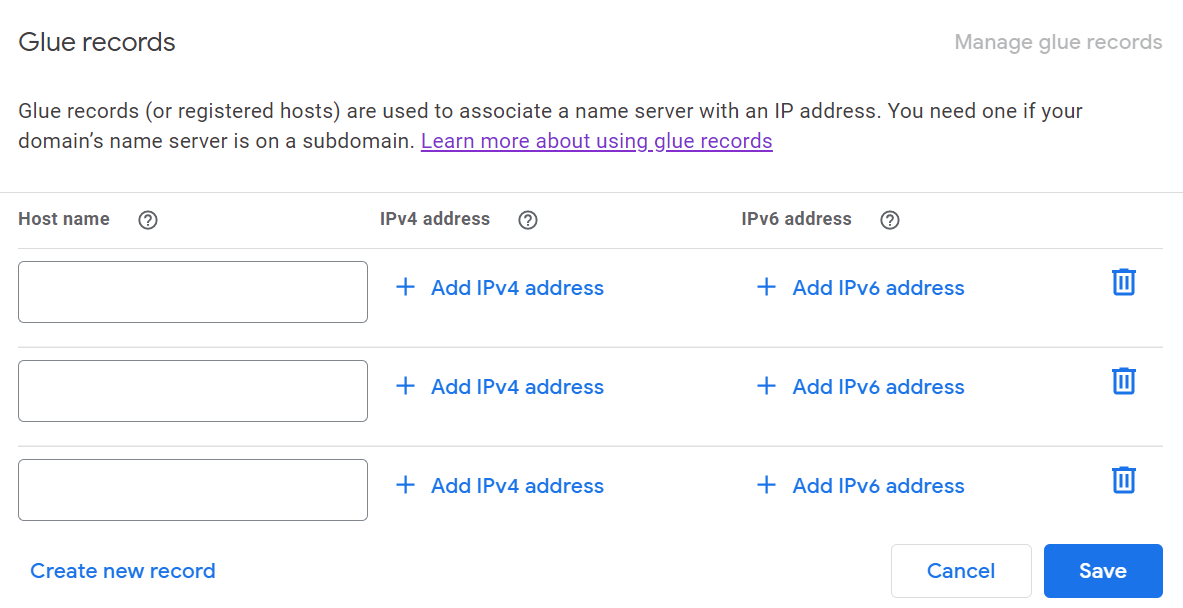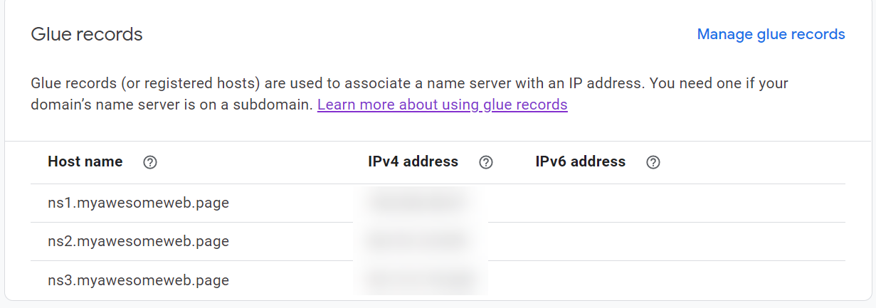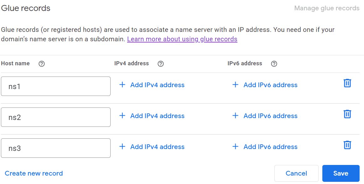 On the Glue records page, click the Add IPv4 address button for each name server. Your screen should look like the one below: